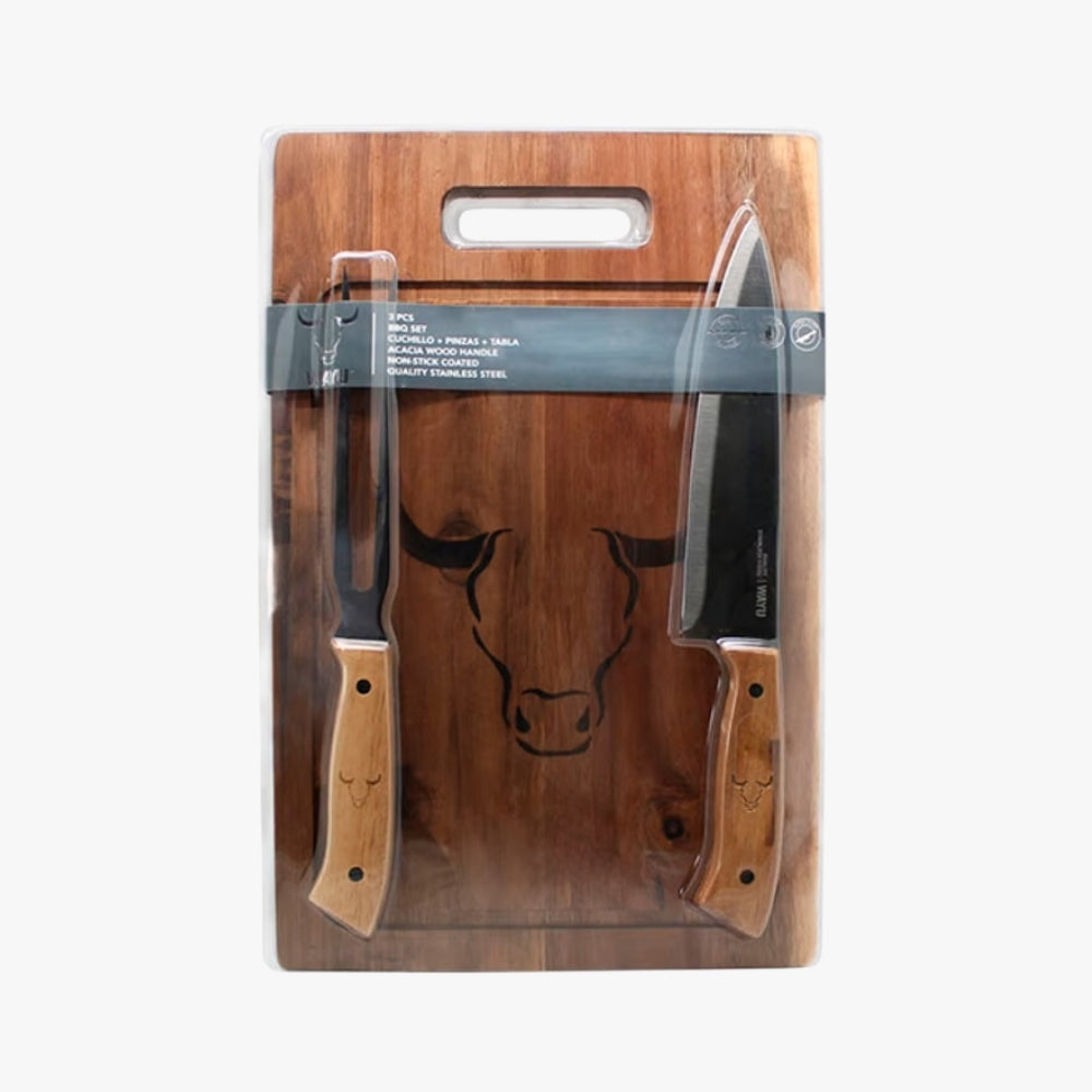 El Set Tabla Cuchillo y Tenedor PRM Wayu es el conjunto perfecto para los aficionados a los asados. Este set incluye una tabla de madera de alta calidad, junto con un cuchillo y un tenedor diseñados especialmente para cortar y servir carnes asadas, ofreciendo todo lo necesario para una experiencia de parrillada profesional.