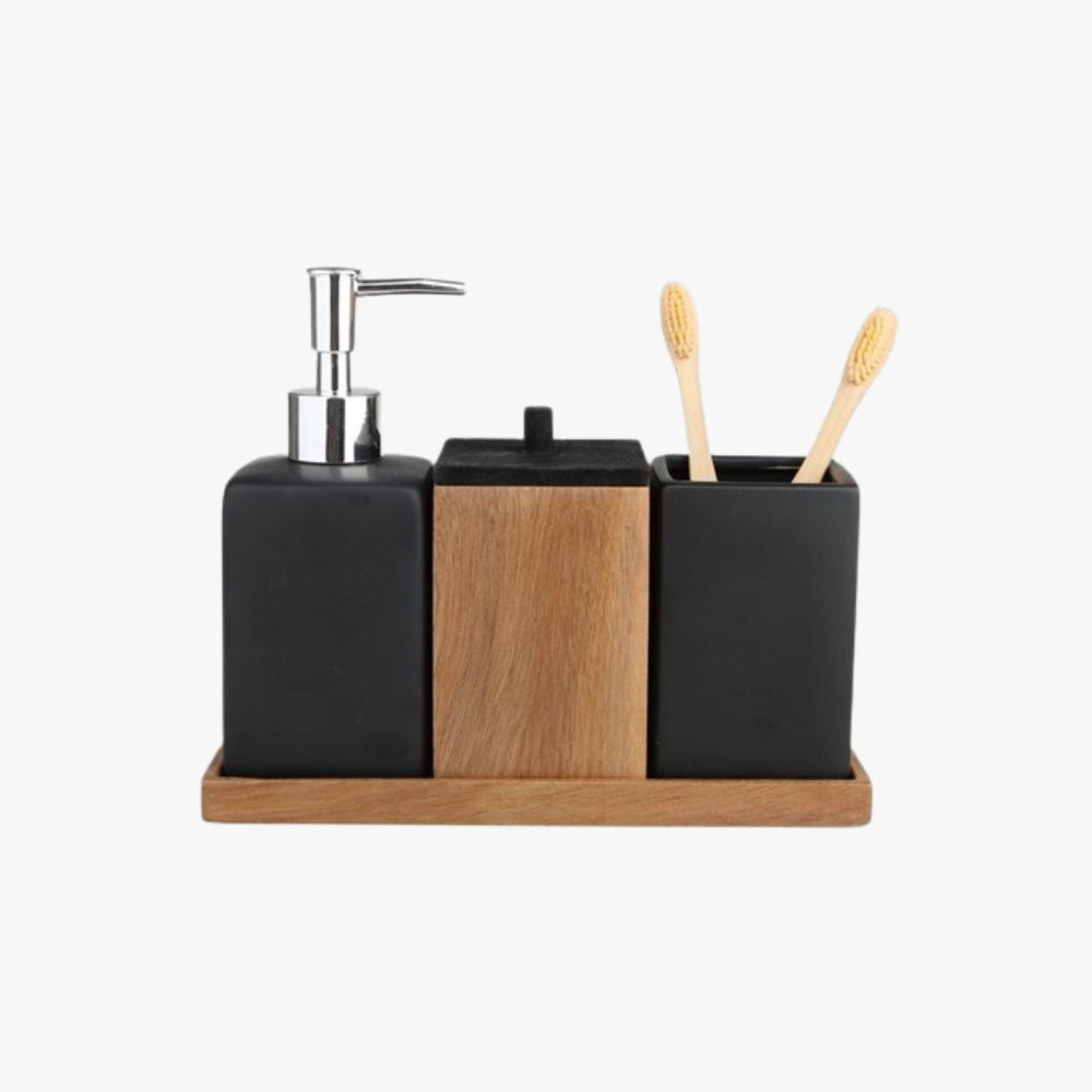 SET DE BAÑO PREMIUM 4 PIEZAS DISPENSADOR JABÓN LIQUIDO NEGRO BAMBU