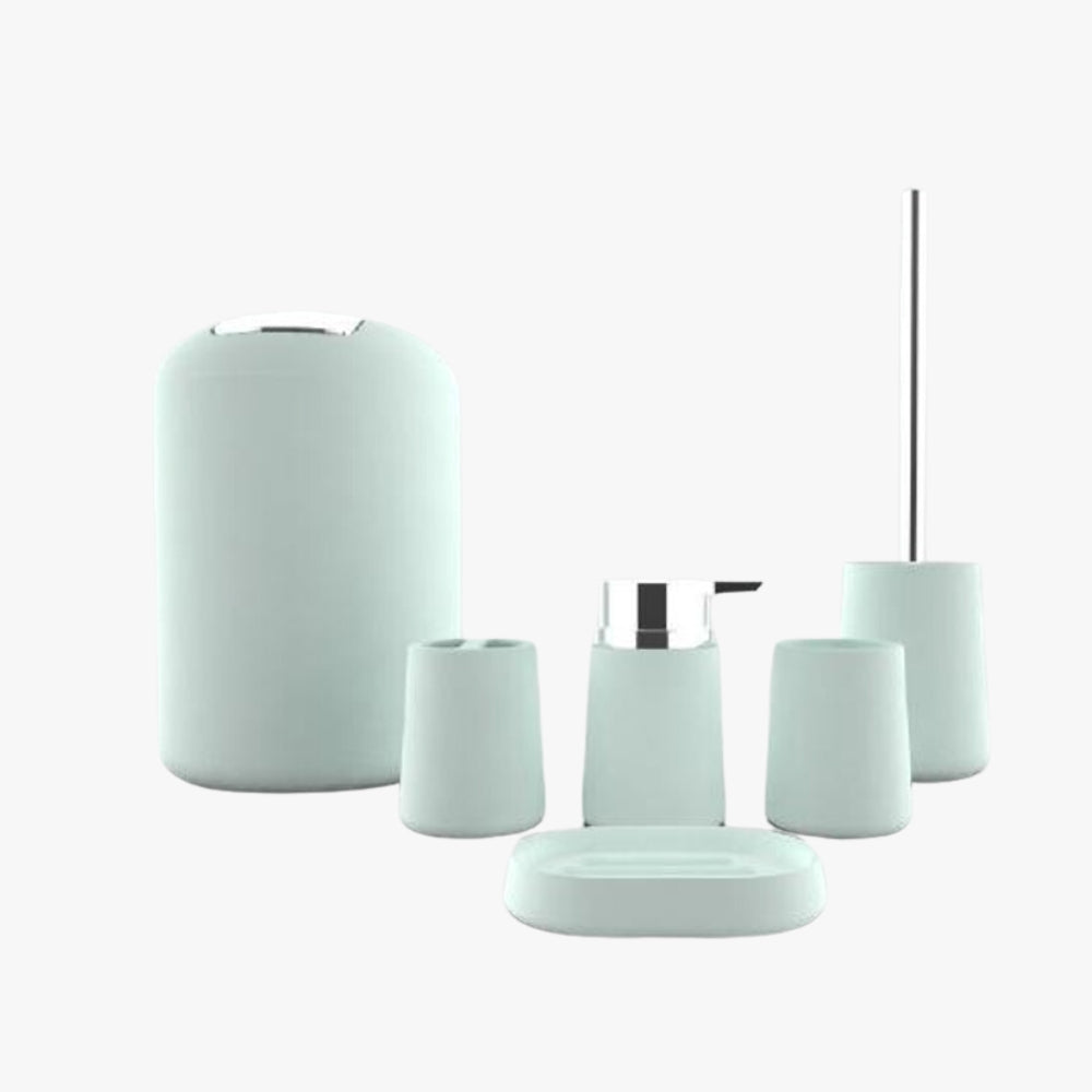 El juego de baño de 6 piezas incluye un cepillo para lavado y almacenaje en un hermoso color verde. Organiza tu baño de manera eficiente y mantén todo limpio con este set. Ideal para un baño moderno y funcional. ¡Haz tu rutina diaria más fácil con este juego de baño!