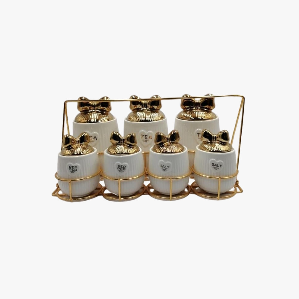 Este juego de 7 piezas en color dorado con blanco es la solución perfecta para mantener tu café, té o especias organizados de manera elegante. Con este juego organizador, podrás tener a mano tus bebidas favoritas y condimentos, sin ocupar mucho espacio. Mantén tu cocina ordenada y con estilo.