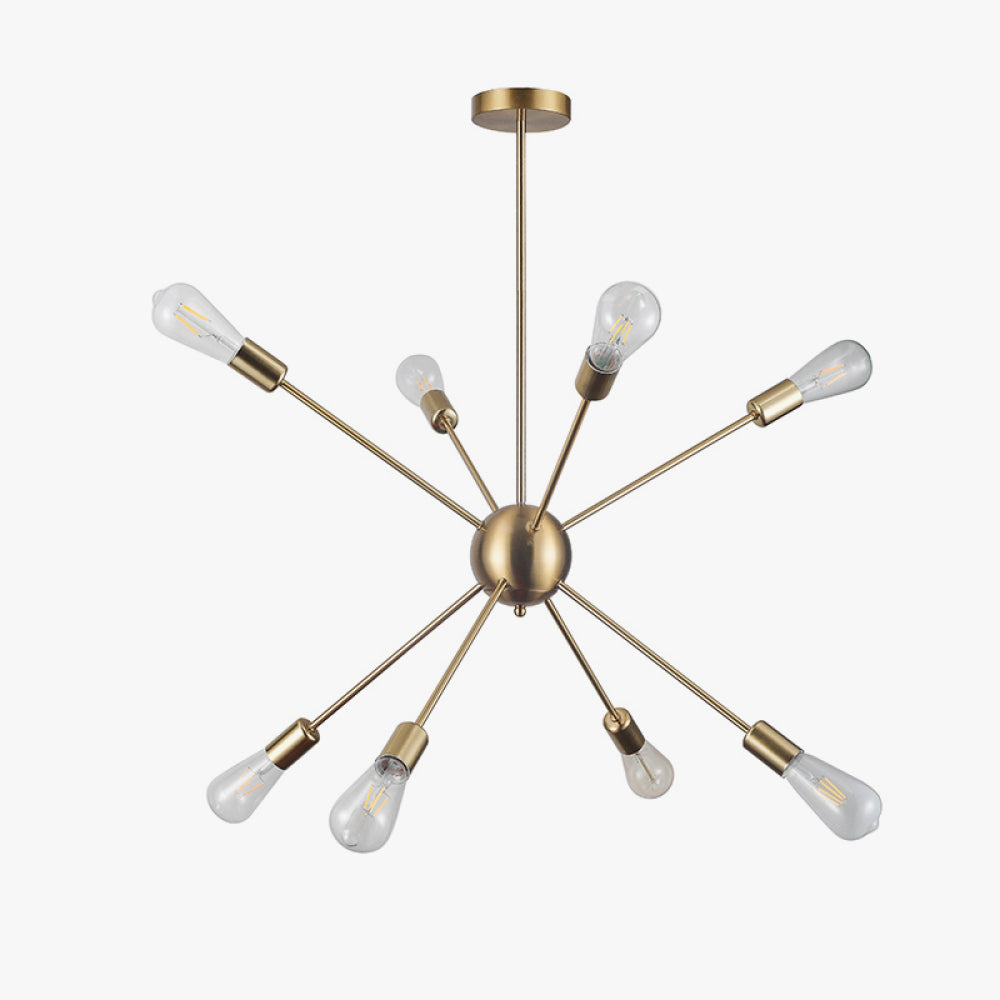 El centro de esta araña dorada de 8 luces es una bola, que puede soportar 4 brazos de lámpara, como un erizo como un satélite, con bombillas Edison u otras bombillas estándar, que pueden proporcionar efectos explosivos de radiación. Se puede utilizar para estilos de decoración a mediados de este siglo. También se puede utilizar para decoración moderna. Con 4 varillas, puede ajustar la altura de la suspensión según sea necesario, y también es adecuado para techos inclinados.