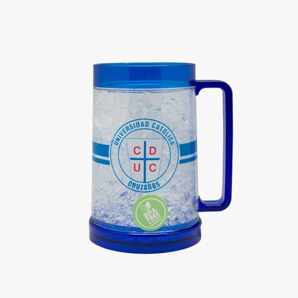 Con una capacidad de 600 ml, es ideal para disfrutar de cervezas, jugos o cualquier bebida refrescante mientras muestras tu amor por la UC. Su diseño "Frozen" no solo aporta un toque visual impresionante, sino que también le da una sensación de frescura a cada brindis.